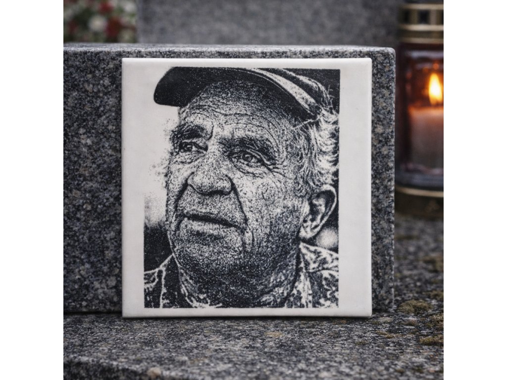 Keramická fotka na hrob v netradičním pojetí vzhledu i technologií o rozměru 10x10 cm. Z keramické dlaždice vytvoříme důstojnou vzpomínku ve formě gravírované fotky na hrob.
