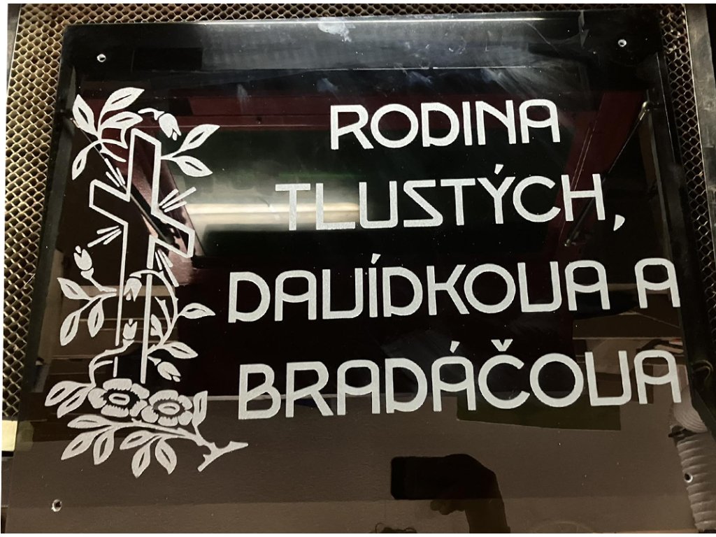 Černé sklo je elegantní, pevné a trvalé. Naše náhrobní desky vyrábíme pomocí laseru - je to velmi přesná technologie která dokáže velmi věrně převést text včetně fotek v nejvyšších detailech, vznikne tak trvalé nesmazatelné značení, zanesené do povrchu skla se stříbrným vzhledem. Takové značené nikdy nevybledne, je odolné vůči počasí a vydrží tak celé generace. Sklo je skvělá alternativa vůči tesání textů přímo do kamene - trvanlivostí, přesností, individualismem i cenou.